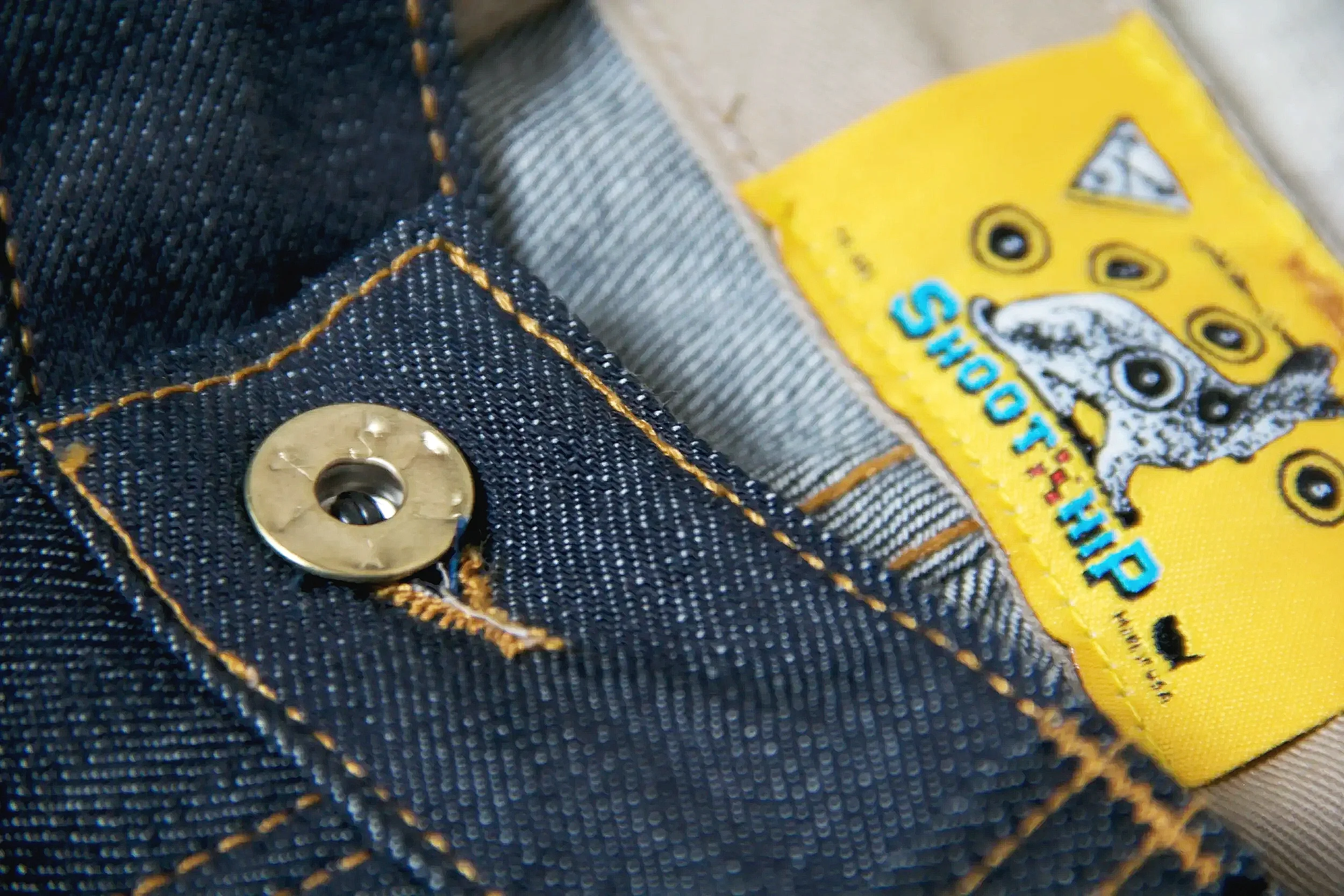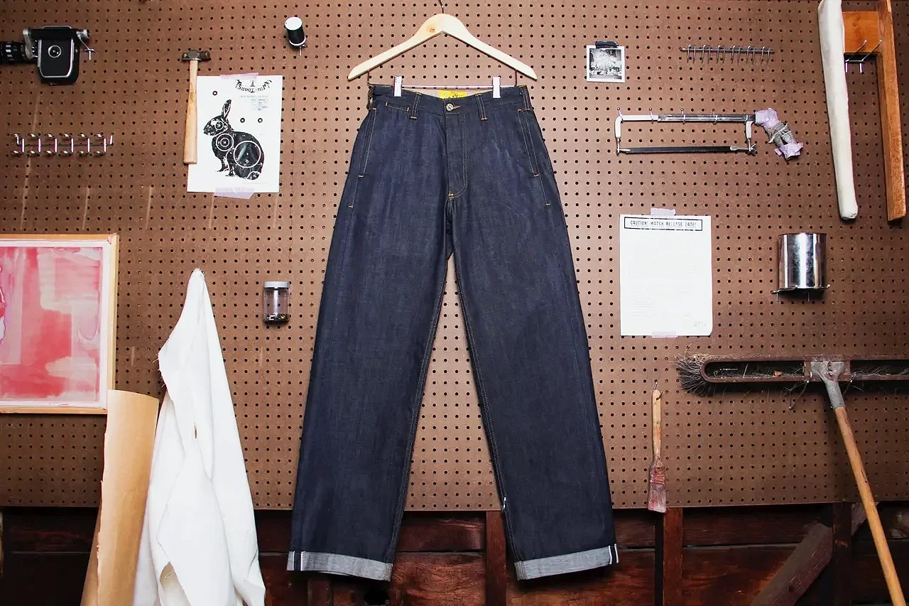 Crafted in the USA from 14oz Cone Mills selvedge denim, this flat-front chino combines rugged heritage with a relaxed contemporary fit. Pressed with a crisp pleat, finished with a traditional chino cuff featuring a reversed hem, and secured with an adjustable waist cord, it carries both field-ready function and refined structure.
